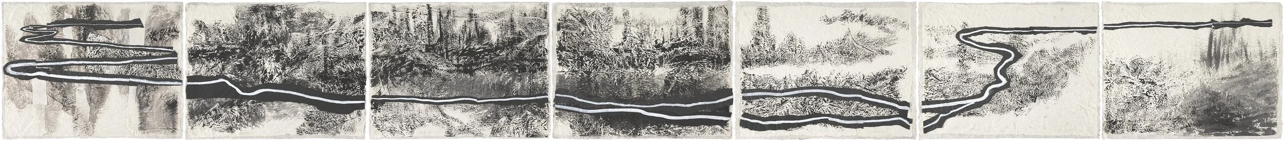 "Tidbinbilla 7' 2024 ink, charcoal powder and tissue on Kanagawa paper (46 x 434 cm)