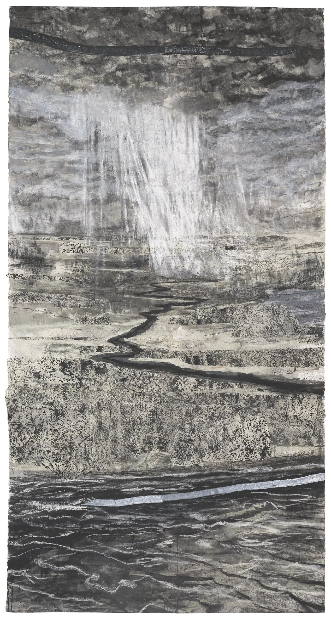 'Water Falling Through All of Time' 2024 ink, charcoal and tissue on Arches oil paper (250 x 130 cm) photo credit: Brenton McGeachie